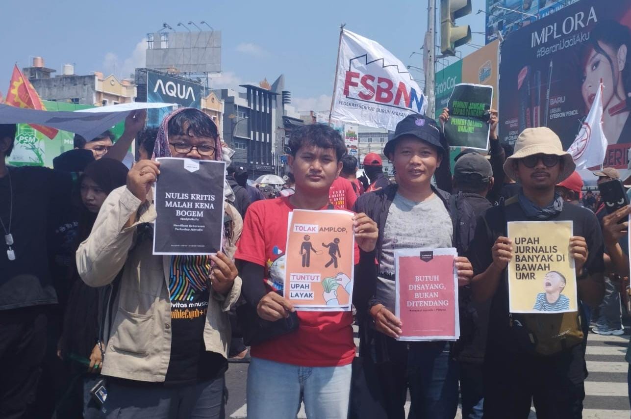 Dalam aksi damai di Bundaran Tugu Adipura, AJI bergabung bersama elemen buruh dan masyarakat sipil, menyuarakan persoalan yang selama ini kerap luput dari perhatian kepada nasib jurnalis sebagai pekerja.