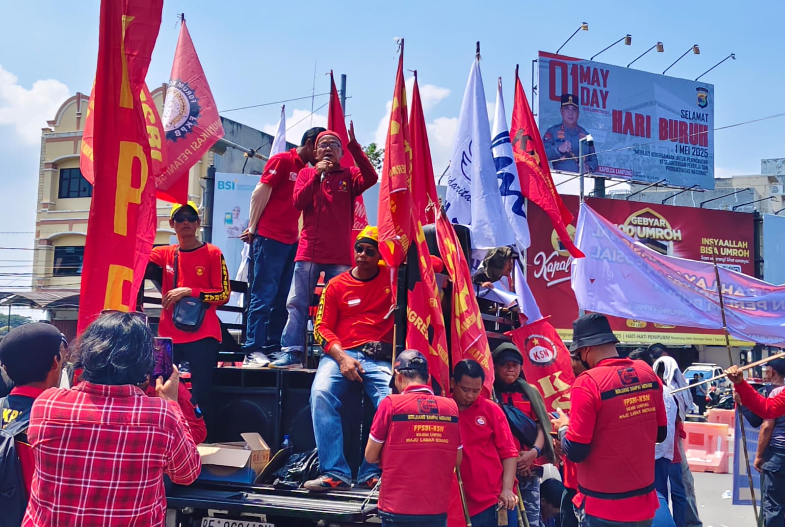 Onetime.id – Ratusan massa yang tergabung dalam Aliansi Perjuangan Rakyat Lampung turun ke jalan memperingati Hari Buruh Internasional (May Day) di Bundaran Tugu Adipura pada Kamis, (1/52025).