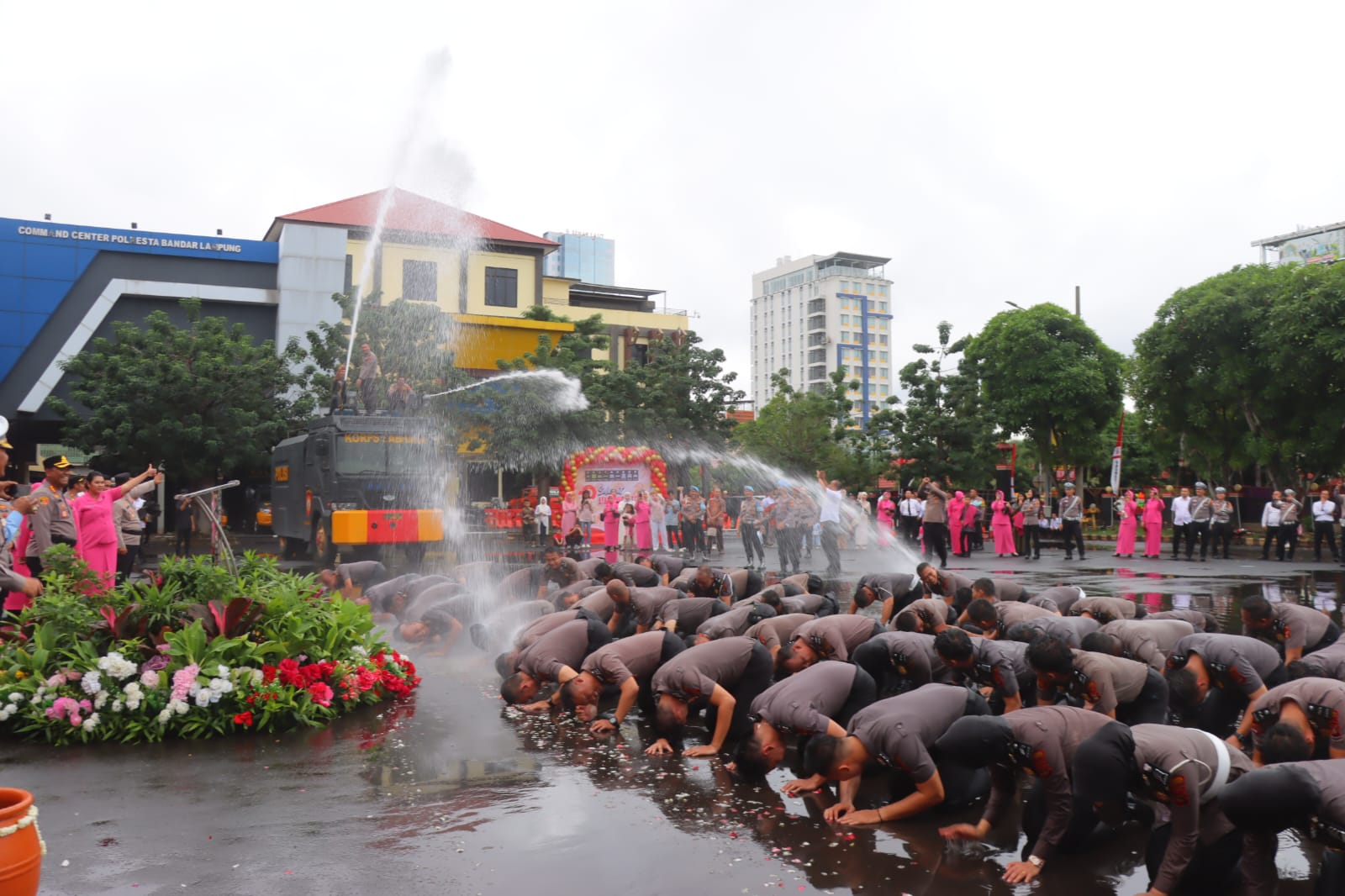 Usai upacara, kegiatan dilanjutkan dengan tradisi siraman air kembang yang dipimpin oleh Kapolresta Bandar Lampung diikuti oleh Waka Polresta Bandar Lampung, Pejabat utama, Kapolsek dan Bhayangkari.