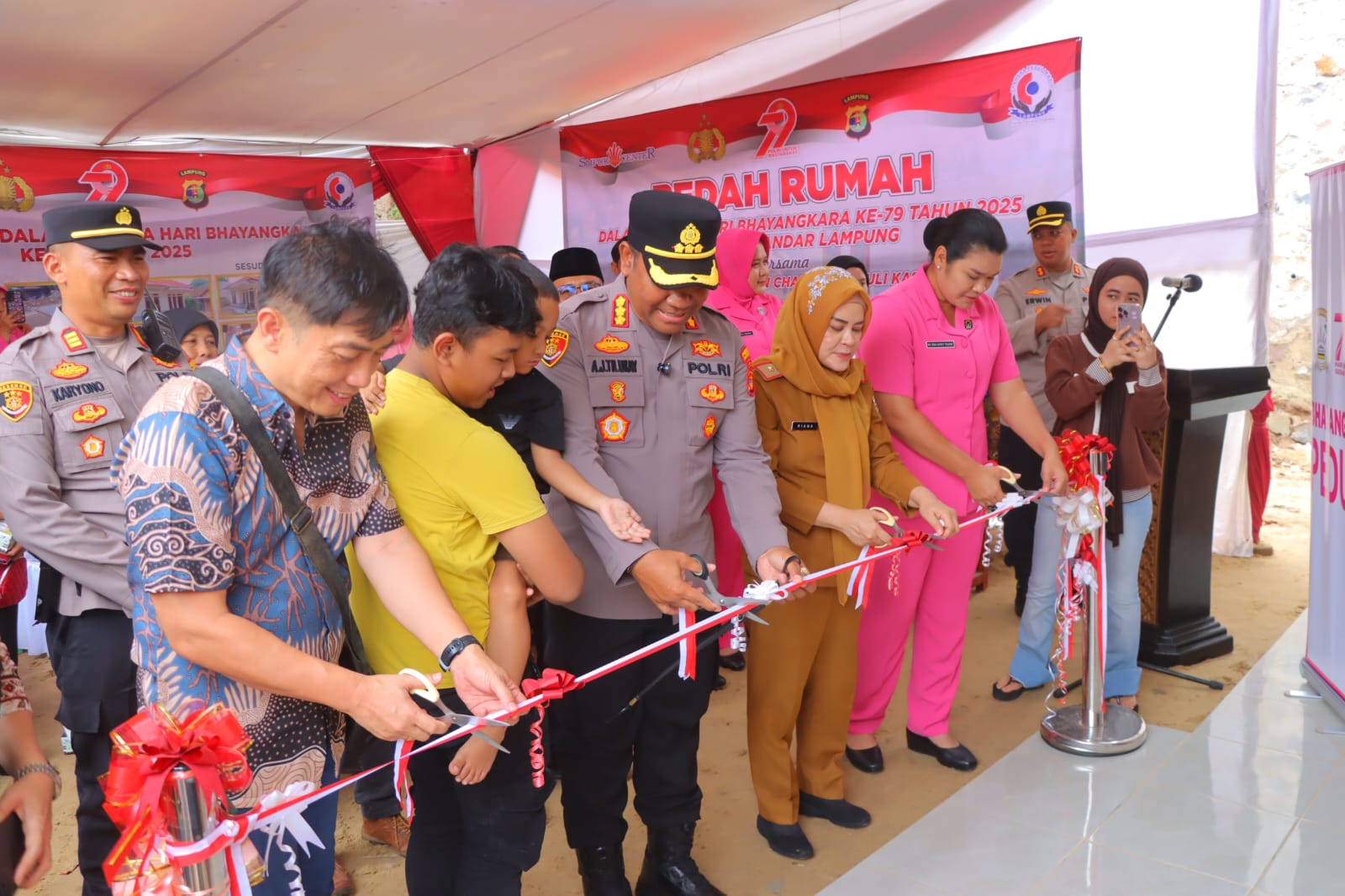 Peresmian rumah ditandai dengan pengguntingan pita oleh Kapolresta dan dihadiri Wakapolresta, Ketua dan Wakil Ketua Bhayangkari, serta perwakilan pemerintah dan mitra swasta yang mendukung pembangunan.