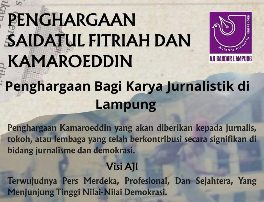 Onetime.id, Bandar Lampung – Aliansi Jurnalis Independen (AJI) Bandar Lampung kembali membuka pendaftaran Anugerah Saidatul Fitriah dan Kamaroeddin.