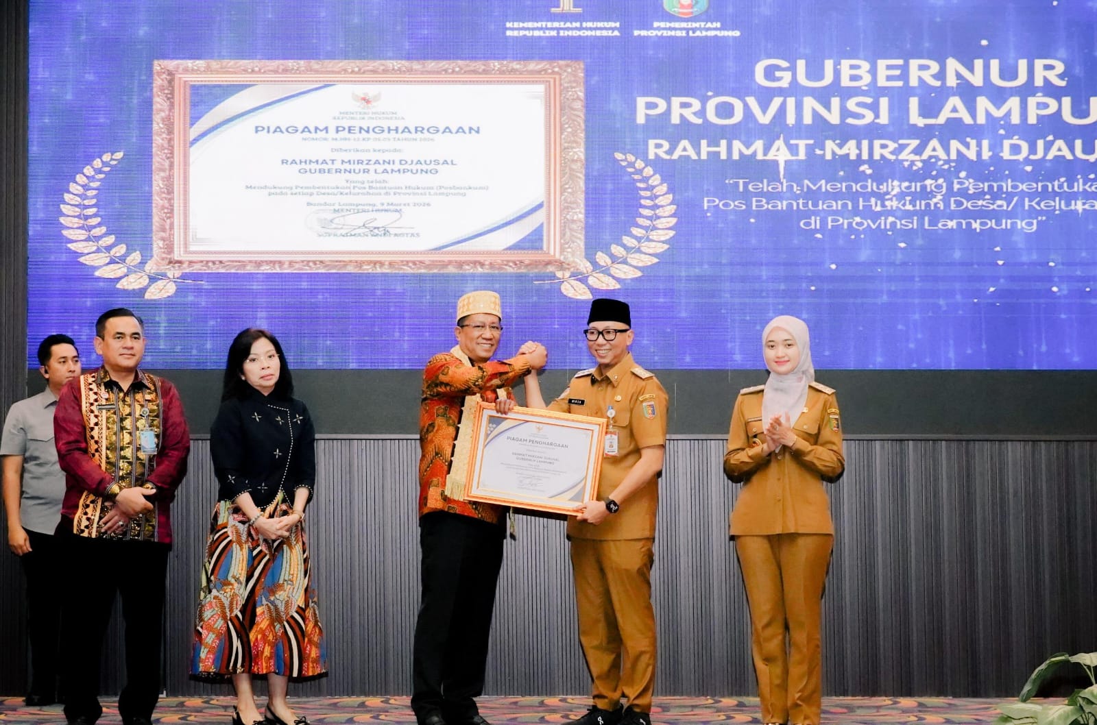 Penghargaan juga diberikan kepada Gubernur Lampung atas keberhasilan membentuk 2.651 Pos Bantuan Hukum di seluruh desa dan kelurahan.