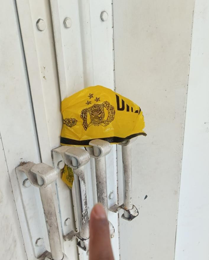 Garis polisi terpasang pada pintu rolling door, menandai lokasi masih dalam pengawasan.