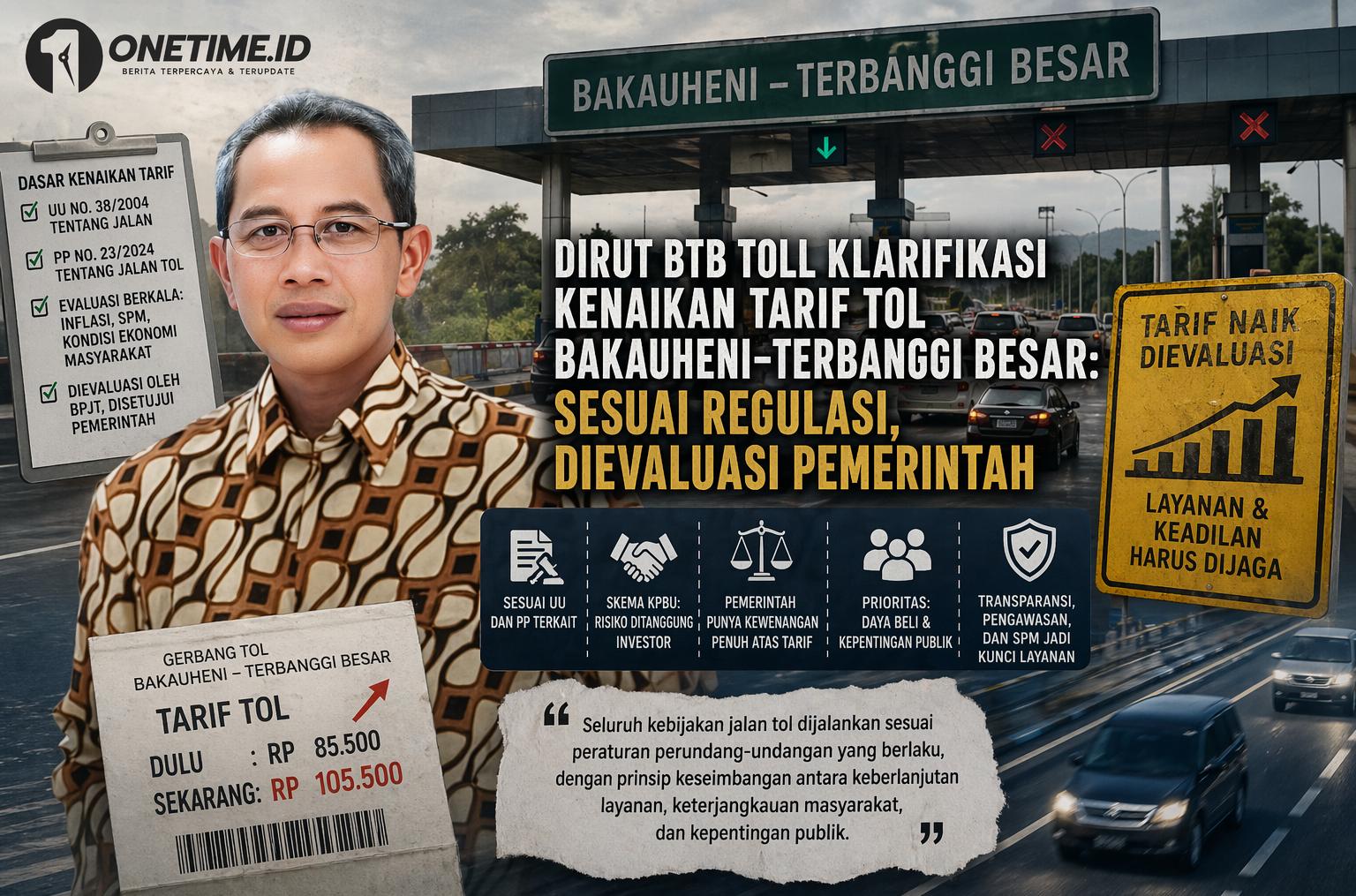 Onetime.id, Bandar Lampung – Direktur Utama PT Bakauheni Terbanggi Besar Toll (BTB Toll), I Wayan Mandia, memberikan klarifikasi komprehensif terkait polemik kenaikan tarif Jalan Tol Bakauheni–Terbanggi Besar yang belakangan menuai sorotan publik.