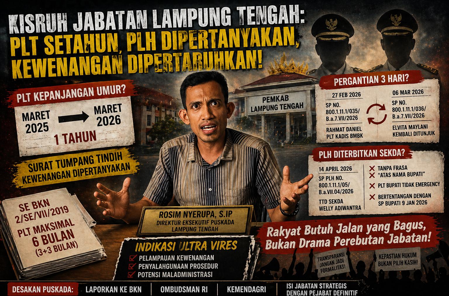 Direktur Eksekutif PUSKADA Lampung Tengah, Rosim Nyerupa, menegaskan praktik penunjukan jabatan sementara yang berlangsung saat ini berpotensi mencederai prinsip meritokrasi, kepastian hukum, dan akuntabilitas pemerintahan.